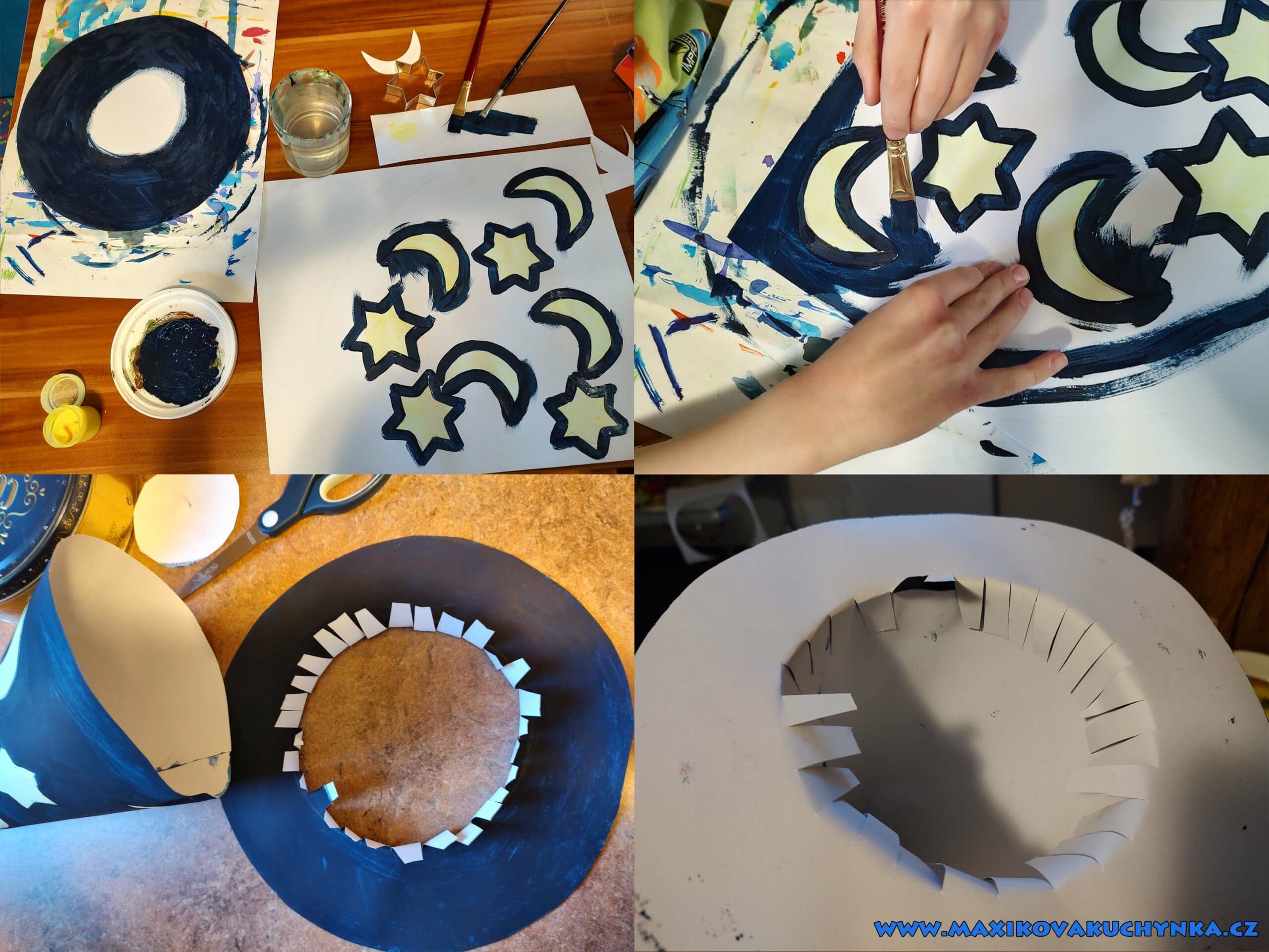 Na druhý výkres jsem obkreslila velkou poklici a vystřihla kolo, které mělo tvořit lem klobouku. Obě části Max vybarvil namíchanou modro-černou temperou.